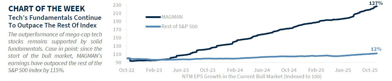 - Strong earnings growth: Unlike the late 1990s, today’s AI surge is driven by companies with solid fundamentals and real profits. Back then, businesses were rewarded simply for having ‘dotcom’ in their name. Today’s AI leaders are profitable and growing. For example, since the start of this bull market, our MAGMAN* composite has increased earnings by 127%, compared to just 12% for the rest of the S&P 500. Better than expected results in 3Q25 reinforce this trend. Even Fed Chair Jerome Powell highlighted the distinction in his recent remarks, noting that AI-related capital spending is now a meaningful contributor to US economic growth. NVIDIA’s earnings next Wednesday will also be key.