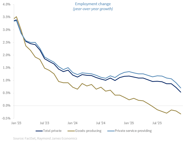 The biggest concern for the Federal Reserve (Fed) today is the weakness in employment over the last year, and especially during the second half of the year. This weakness was behind its decision to resume interest rate cuts in September of 2025. Although the weakness in job growth was evident in the goods-producing sector of the economy for a long time, the weakness in employment in the services side of the economy became apparent during the second half of the year, as can be seen in the graph below.
