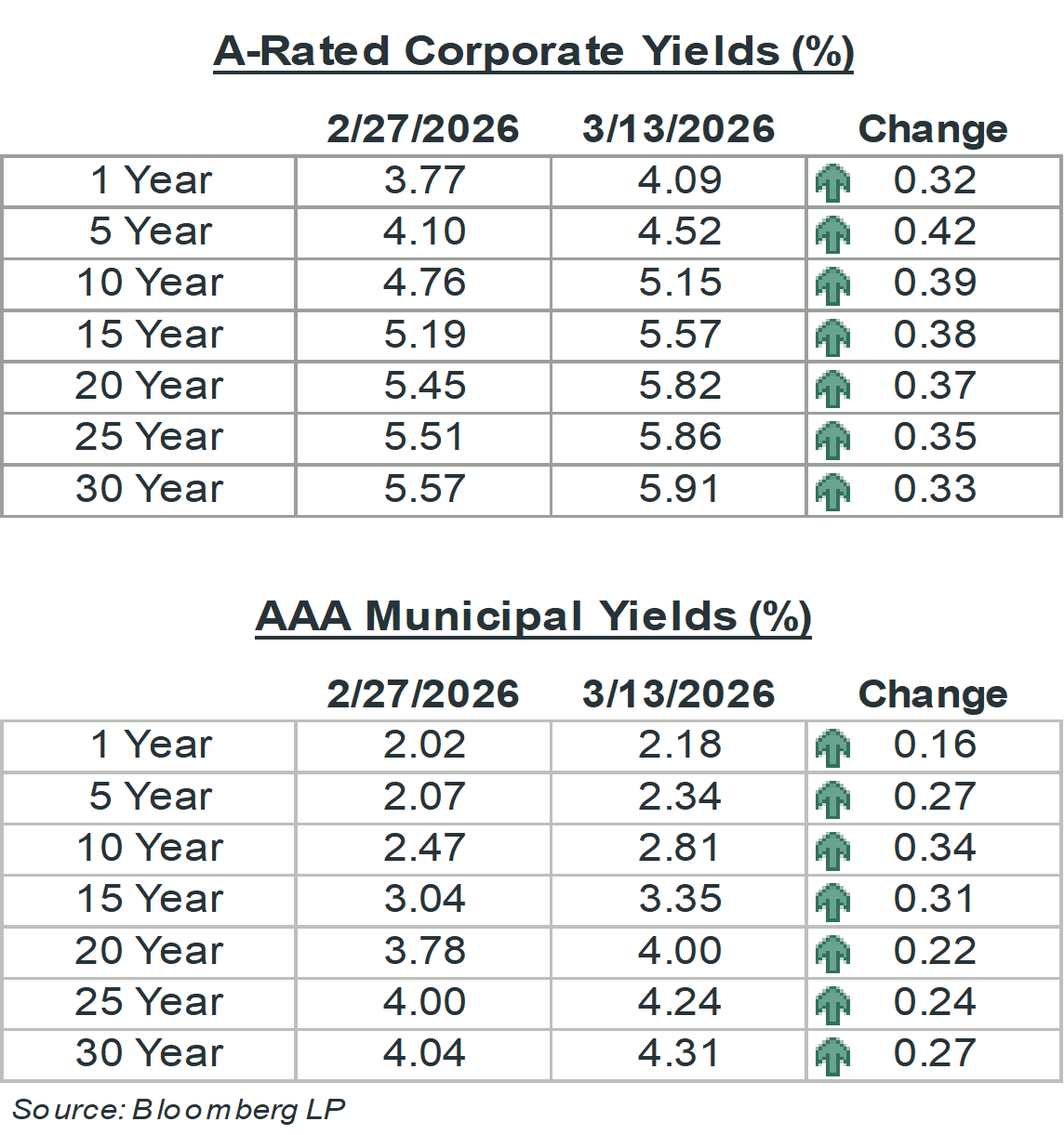 The traditional reaction to a major military conflict is a flight to quality, also known as a “risk-off” trade. In the fixed income arena, this typically leads to Treasuries rallying (prices higher, yields lower). What has ensued over the past few weeks is exactly the opposite. Why? Markets appear to be more concerned with the potential impact that the Iran conflict could have on inflation than the need to seek out the safety of Treasuries. The price of oil has risen from the mid-$60’s just prior to the conflict to the mid-$90’s just two weeks later, an increase of over 40% (price per barrel of West Texas Intermediate). The longer that these elevated price levels persist, the greater and longer an impact there is likely to be on inflation. In addition to the impacts on inflation, the cost of the war is creating further concerns among those that were already worried about the United States’ budget deficit. In a briefing to Congress last week, the Pentagon estimated that the first six days of the war cost at least $11.3 billion. Given that the estimate is likely low and we are now over two weeks into a conflict that has no clear end in sight, the concern that the war is going to lead to increased borrowing by the Federal government is a legitimate one.
