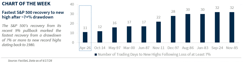 After a 9.1% drawdown, the S&P 500 surged 11% over the last 12 trading days to a new record high, breaking above the 7,000 level for the first time. To put this move into perspective: it ranks in the 99th percentile of returns since 1980 and marks the fastest recovery to new highs following a 7+% drawdown on record.